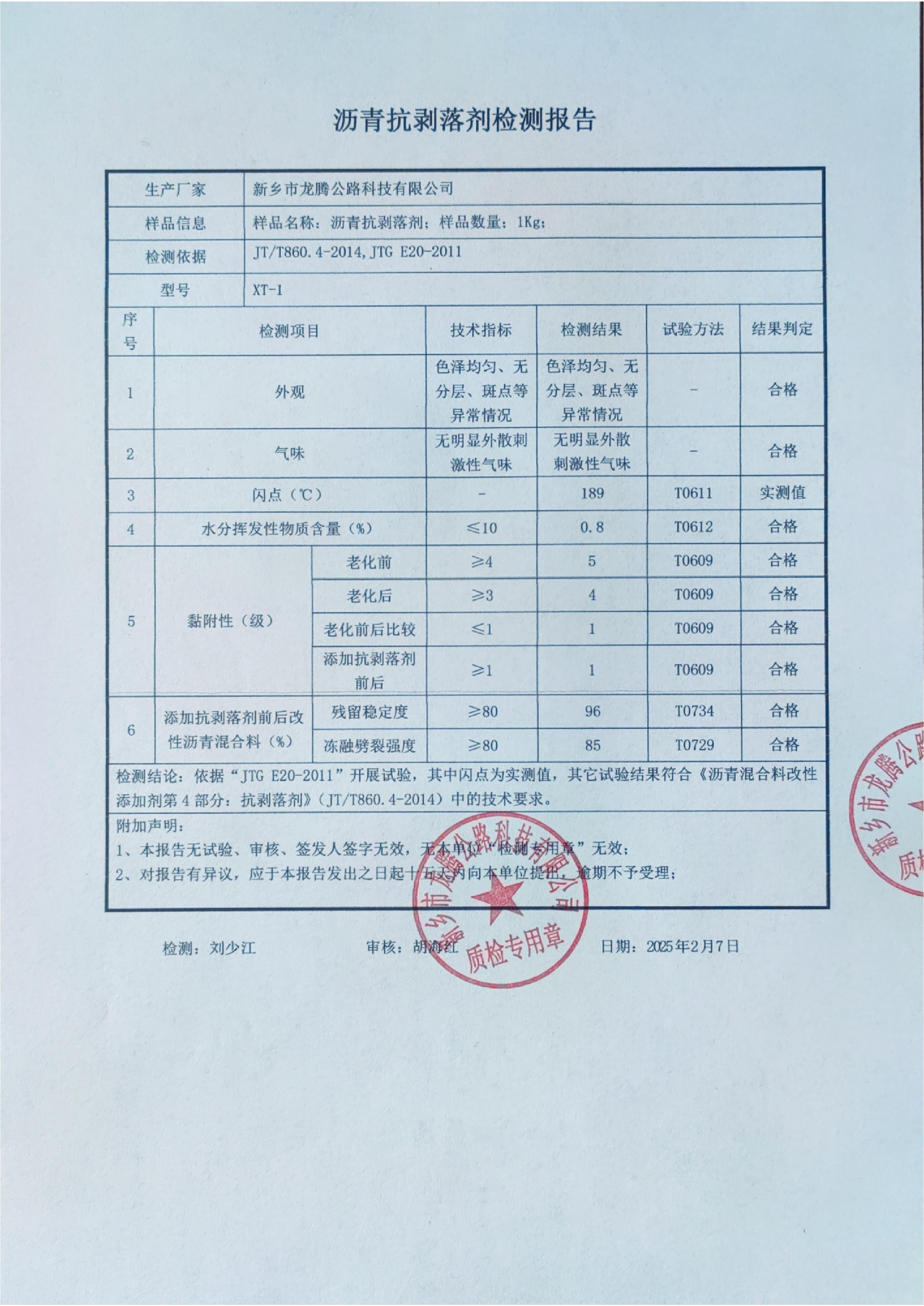 检测报告发布:龙腾之路抗剥落剂性能全达标