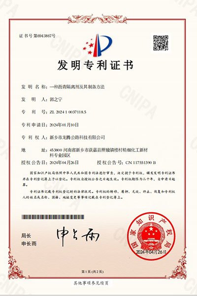 近日,新乡市龙腾公路科技有限公司自主研发的“防黏隔离剂”产品,凭借其创新的技术原理与显著的应用效果,成功获得中国公路学会专利产品推荐。这一认证,是行业权威机构对公司技术创新能力与产品实用价值的充分肯定。
